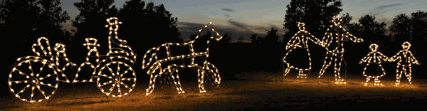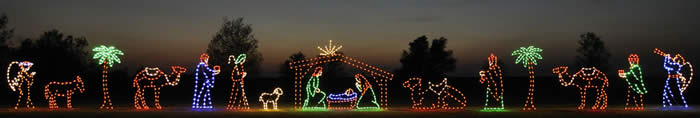 Nativity Scenes in LED color or LED warm white lights. Individual pieces or smaller displays also are available.